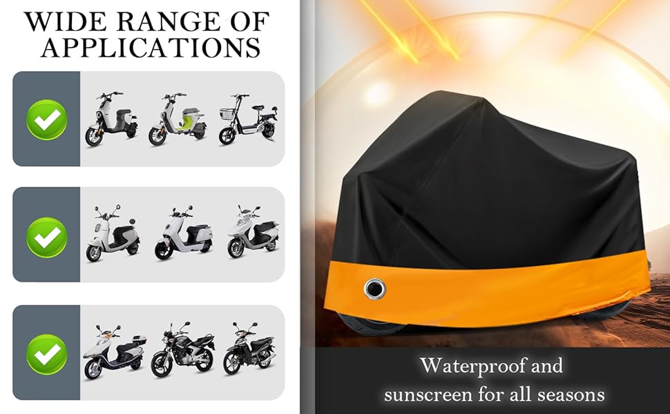 Park with Confidence: The motorcycle cover is designed with the safety and protection needs of motorcycles in mind, with special anti-theft holes at the bottom to lock the motorcycle to a fixed object. It gives you more peace of mind when parking