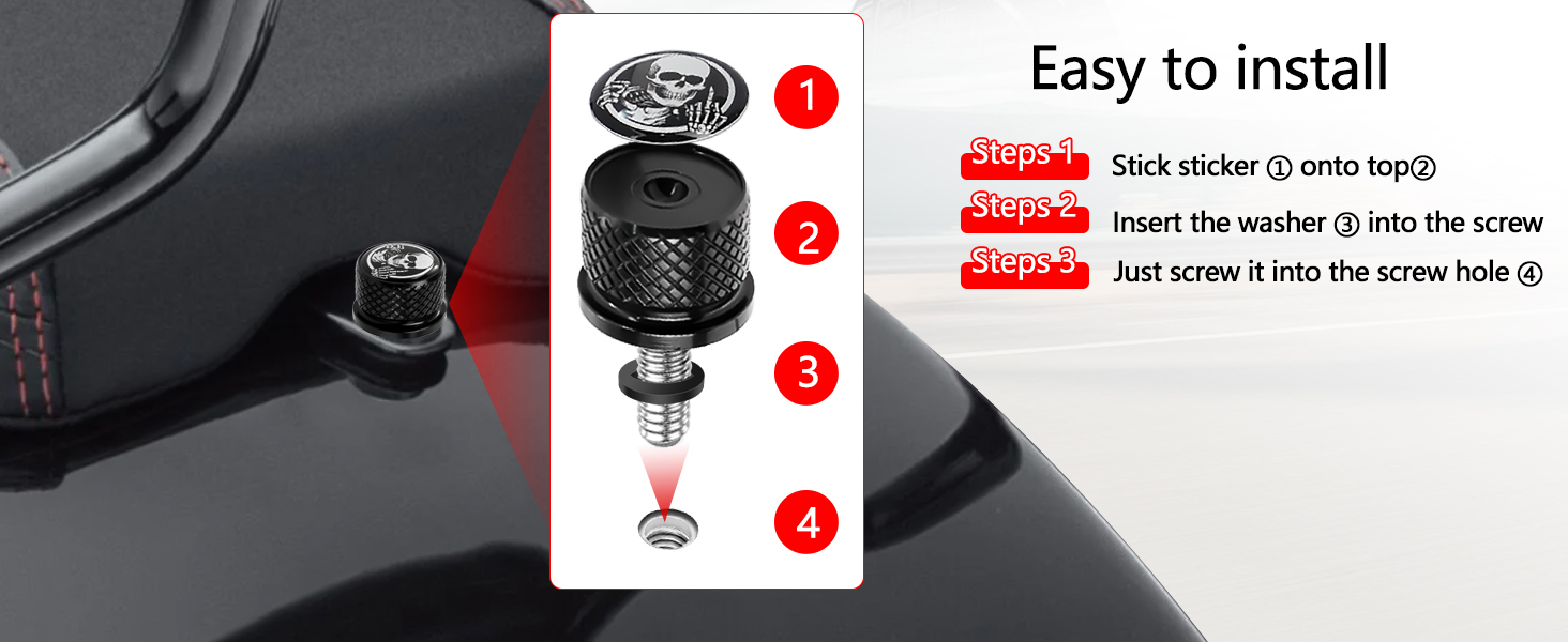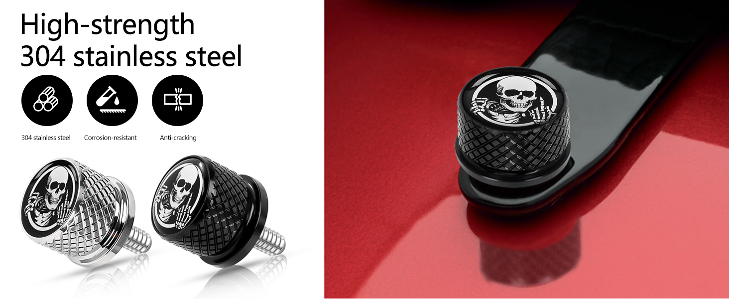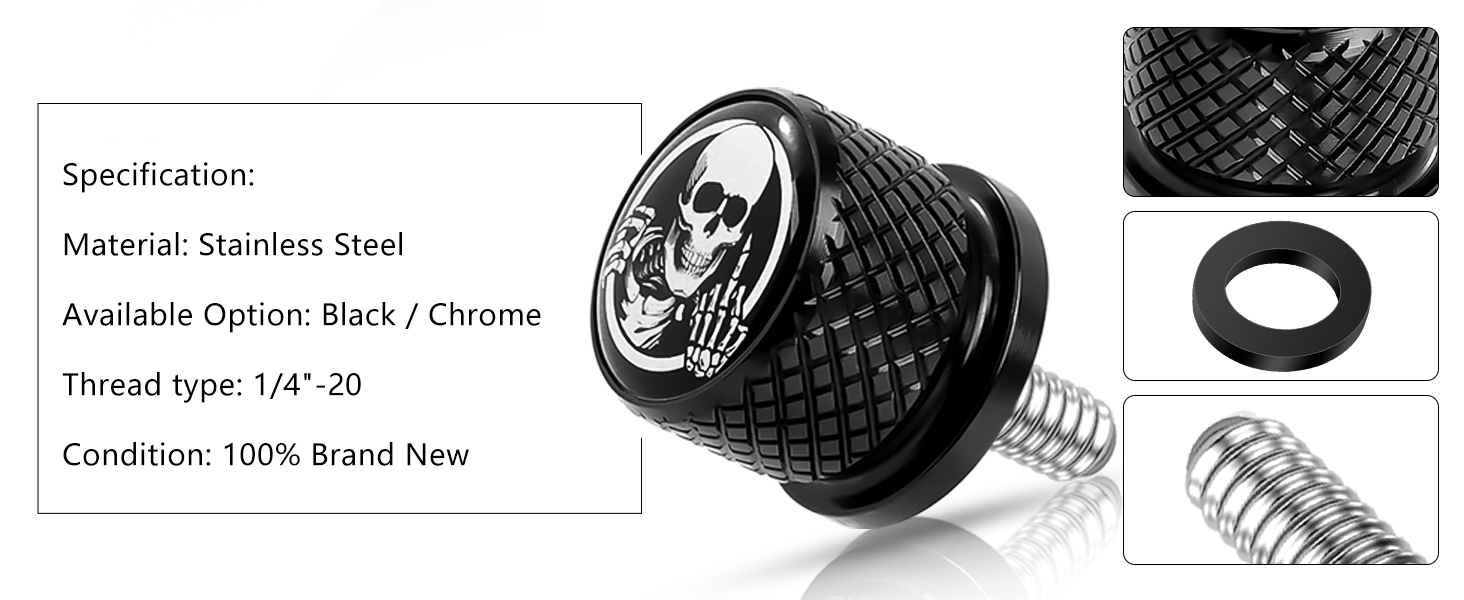 What’s Included: Your package includes one stainless steel bolt, a skull sticker, and a rubber gasket. The rubber gasket helps prevent loosening and wear for added durability. Please note: the thread type is 1/4″-20. Ensure compatibility by checking the thread type of your existing bolts before purchase.
